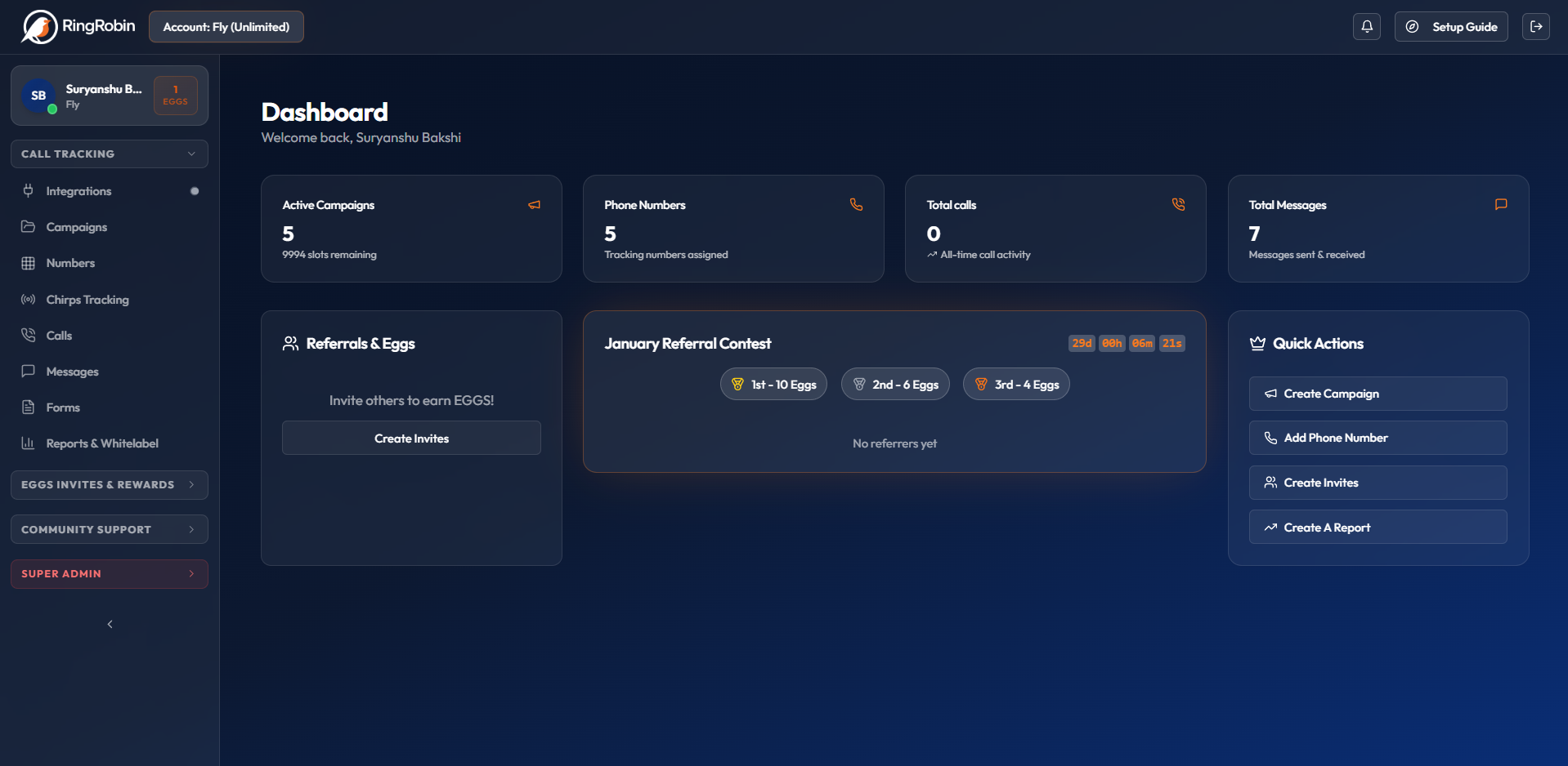 RingRobin works on a referral basis, where you get one campaign as soon as you register, and then you unlock further campaigns, numbers, and domain tracking by referring other users.